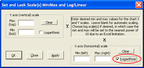 If you are using Excel 2007 or later the restriction shown in the dialog window about the scale min and max being set to the nearest power of 10 does not apply. However, if you choose "non power of 10" values for the min and max the vertical (frequency) gridlines will have unusual values and be very difficult to interpret.