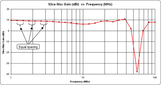 "ROW()-11" is used in a formula on row 12 the result is "1", when used in row 13 the result is "2", and so on. Hence"ROW()-11" is the equivalent of"N-1" . Finally, the outer"ROUND(..., 3)" rounds the calculated frequency to the closest KHz.Now why on Earth would you go to all this trouble? Calculate and tab to the Custom sheet. Change the Y axis selection to "Slice Max Gain".