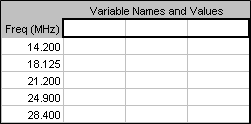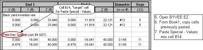 Now return to AutoEZ and open EZNEC sample model BYVEE.EZ. Switch back to Book1 and copy the cells you previously pasted. The group of cells will probably still be selected so all you have to do is press Ctrl-C. Switch back to AutoEZ,