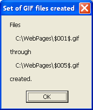Now you have the frames of the movie. For the second step you'll need a separate "GIF Animator" program. The one that I have used for many years is GIF Construction Set Professional by Alchemy Mindworks. Another nice program is Easy GIF Animator by Blumentals Software. Both of these programs are very reasonably priced. (I have no affiliation with either company.) If you're looking for "free" as opposed to "low cost" you can find several recommendations at this gizmo's freeware page.