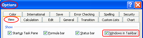 If you don't see a new icon you can adjust the Excel options in order to make it appear. With Excel 2003 and earlier click Tools > Options on the Excel menu bar. In the Options dialog select the View tab then select the "Windows in Taskbar" option.