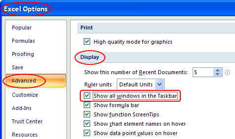 With Excel 2007 click the large "Office" button and then the "Excel Options" button. With Excel 2010 click the "File" menu and then the "Options" button, just above the "Exit" button. In the Excel Options dialog select Advanced then scroll down to the Display section and select the "Show all windows in the Taskbar" option.