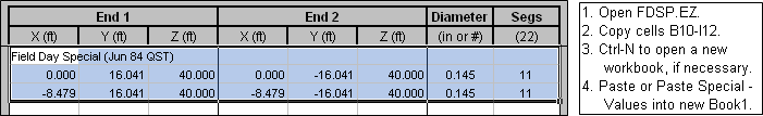 What happened to the two original sources for the FDSP wires? Well, all you did was copy out and then paste back in the wires of the FDSP model, not the wires and the sources. Using a scratch workbook in the manner just described is similar to the EZNEC "Importing Wire Coordinates" feature. It is not the same as the EZNEC "Combining Antenna Descriptions" feature. (You can find both those terms in the EZNEC Help.)