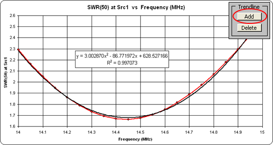 "SWR at Src" and make sure the X axis selection is"Frequency-Line" and not"Frequency-Column" . Click the Add button in the "Trendline" frame.