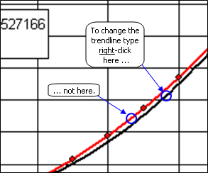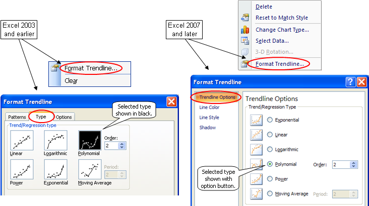 With earlier versions of Excel you can click on one of the other large squares to change the type, or leave the type as polynomial but change the order. Click OK to see the change on the chart. With later versions of Excel the changes are interactive. When you make a new selection or change the polynomial order, the trendline, the equation, and the R2 value will all change immediately.