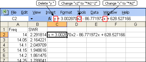 Although it is fun to generate different types of trendlines for different sets of data, to do anything useful you need the coefficients of the equation for use in other Excel formulas. You could of course manually transcribe the numbers but that's prone to error. To illustrate two better techniques let's first copy the X axis data (Frequency) and Y axis data (SWR) to a scratch workbook.
