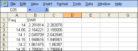 Press Ctrl-N to open a new, blank workbook. Enter two column headers, "Freq" in cell A1 and "SWR" in cell B1. Back on AutoEZ, tab to the Calculate sheet, drag through all the Freq cells