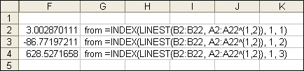 F2-F4, enter these formulas:=INDEX(LINEST(B2:B22, A2:A22^{1,2}), 1, 1)Note that the "{1,2}" portion is in braces, not parenthesis. The formulas will evaluate to:
