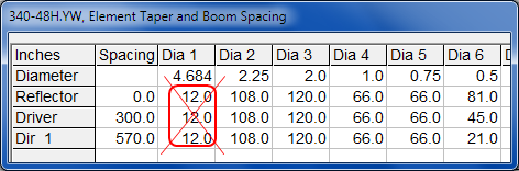 Note that many of the Yagi for Windows (.yw) and Yagi Optimizer (.yag) models have a "boom clamp" as the first taper section. When such models are read via the Open Model File button the boom clamp will be removed automatically and the length of the second taper section will be incremented as necessary. This yields much better Average Gain Test values along with calculated results that are closer to those shown by the YW program. To illustrate, with model