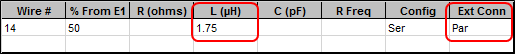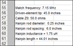 25-j25 ohms (plus or minus several ohms for both R and jX) at the design frequency. If a hairpin is required but no specifications are included with the model, a good first estimate is that the hairpin must provide about +50 ohms of reactance at the design frequency.To convert that reactance value to a load inductance or shorted stub length, first set the "Freq" cell (cell C11 on the Variables sheet) to the design frequency, 7.15 MHz in this example. Setting "Freq" will automatically set the "WL" (wavelength) read-only variable. Then to determine the inductance in µH enter the following formula in a spare cell of the scratch pad area: