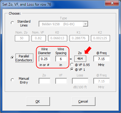 Insr Objs sheet to determine the characteristic impedance Zo for two parallel 0.25 inch diameter wires separated by 6 inches (or whatever the comment shows for hairpin rod diameter and spacing).