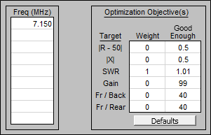 =ATAN(50 / 464) / TwoPi * WLAfter an initial estimate of the load inductance or transmission line length is calculated you can use the optimizer to find a more exact value. Use a variable for the value of the load inductance or the length of the shorted stub transmission line. Optimize on that variable name and use a target weight of 1 for SWR and zero (or blank) for all the other weights.At 7.15 MHz a reactance of +50 ohms equates to about 28.2 inches of near-ideal shorted stub transmission line with a Zo of 464 ohms. Note that the ATAN function returns an angle in radians, not degrees.