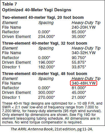 "340-48H.YW" the optimized inductance will be about 2.4 µH and the optimized shorted stub length will be about 60 inches (using the NEC-2D engine). But the minimum possibleSWR(50) will be 1.4. If you want to get a perfect match to 50 ohms, and hence improve thelow-SWR bandwidth, you'll need to optimize on the hairpin inductance or stub length and on the length of the driven element. Doing that two-variable optimization will result in an inductance of 1.46 µH or a shorted stub length of 36.9 inches combined with a tip section length of 39 inches.So why don't those hairpin and tip length values match what is shown in the comments for model
