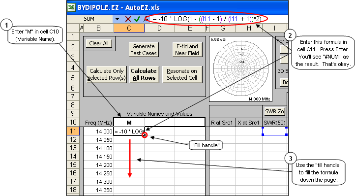 Nth Freq = 10 ^ (Log(FirstFreq) + (N-1) * (Log(LastFreq) - Log(FirstFreq)) / (NumSteps - 1))So let's apply this to the frequency steps on the Calculate sheet, with the assumption that the first frequency will be 1 MHz, the last frequency will be 100 MHz, and the number of frequency steps will be 25. Open, what else, BYDIPOLE.ez. On the Wires sheet use the AutoSeg button to assign 40 segments per wavelength, odd. That way as the frequency changes over the full range from 1 to 100 MHz the single wire of the model will always have the same segmentation density although a different number of segments for each test case.On the Calculate sheet enter "1" as the first frequency in cell B11. Then select cell B12, the second frequency, and enter the following string in the formula bar at the top of the Excel window.