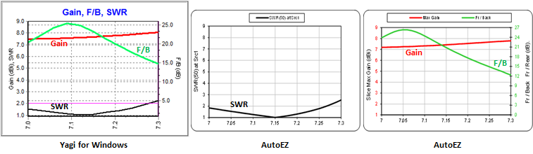 "340-48H.YW" ? The comments are based on an unmatched feedpoint impedance of35.6-j19.4 ohms as calculated by the Yagi for Windows program. YW is a special-purpose program designed strictly for monoband Yagis. It uses neither the NEC nor MiniNEC calculating engine. On the other hand, using the EZNEC NEC-2D engine and with the tip length at 39 inches as opposed to 45 inches, the unmatched feedpoint impedance is31.7-j24.2 ohms. Hence the hairpin must have a different reactance value in order to match to 50 ohms.Regardless of these relatively minor differences the overall performance of the model is remarkably similar between YW and AutoEZ as shown below.