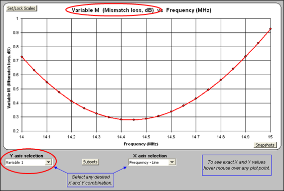 Obviously this is not a very useful chart. It shows exactly what was asked for, namely Frequency on the X axis and SWR on the Y axis. But because the same set of frequencies is repeated three times on the Calculate sheet, the plotted line shuttles back and forth across the page. What is needed is a way to plot just the points for one complete frequency sweep without plotting the other sweeps. The Subsets button allows you to do that.