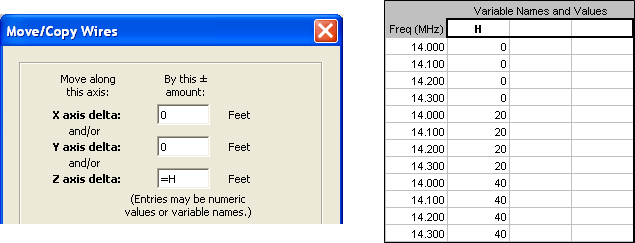 Once again, start by opening BYDIPOLE.ez. On the Wires sheet use the Move/Copy button and specify a Z axis offset using variable H. On the Calculate sheet make the following test case entries.