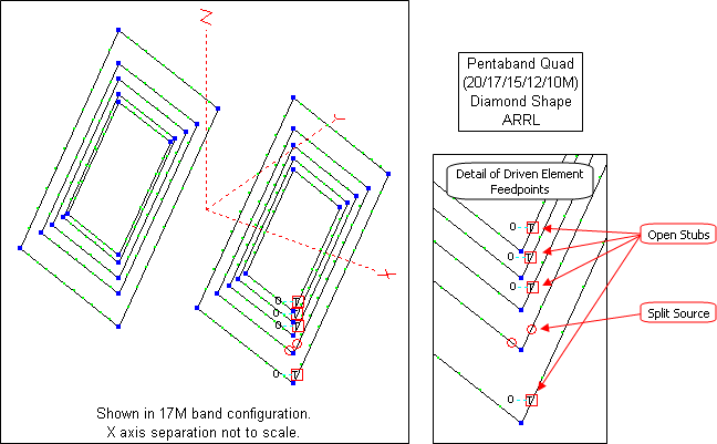 This antenna has the same dimensions as the square Pentaband Quad described earlier. And like that earlier antenna it also includes portions of the feed system in the form of open-circuit stubs.