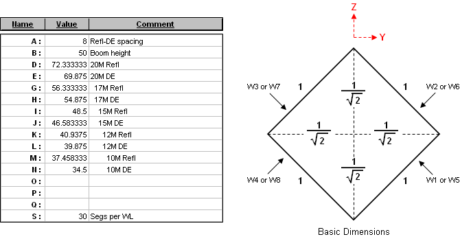 In the above "Basic Dimensions" view the loop circumference is 4 units. Each side is therefore length "4/4" or 1 unit. To convert that diagonal length of 1 to a ±Y or ±Z coordinate requires a division by SQRT(2). Hence if the actual loop circumference is D units the formula for the coordinate is "±D/4/SQRT(2)" instead of "±D/8" as was used for the square shape. So, for example, the 20M reflector (wires