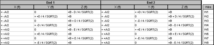 Again, extensive use of the "W#E#" type shortcut makes it easy to define the first loop, then Copy/Paste (to duplicate 4 rows) and Edit/Replace (to change variable names) makes the task a lot less daunting than it seems. And with today's computers the fact that the "4/SQRT(2)" factor is evaluated 80 times (40 wires times 2 ends) is completely inconsequential.