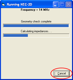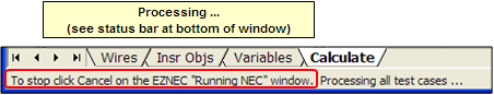 - As of v. 2.0.17 if the status bar at the bottom of the Excel window says "To stop click Cancel ...", or prior to v. 2.0.17 if the status window is not flashing, it means that EZNEC is doing a long-running calculation, either for a model with a large number of segments and/or a frequency sweep with a large number of steps.