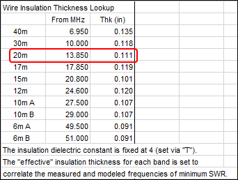 If desired you can modify the table entries by measuring the SWR over a particular band using a VNA or antenna analyzer type instrument, noting the frequency of minimum SWR (the "dip" in the curve), and then changing the "effective insulation thickness" value in the table such that the frequency of the modeled dip matches that of the measured dip. Changing the effective insulation thickness is roughly analogous to setting a "Band Correction Factor" with the