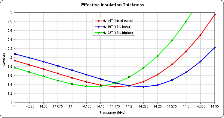For this model and on this band, changing the effective insulation thickness by ±10% changes the frequency of minimum SWR by about ±50kHz. A thinner amount of insulation increases the dip frequency and a thicker amount decreases the dip frequency.