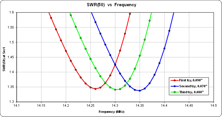 For example, let's say the measured dip was at 14.3 MHz. Run sweeps from 14.100 to 14.500 MHz and use a fairly small step size, say 0.010 MHz. Before running each sweep set the insulation thickness to a different value; after running the sweep use the Snapshot button to capture the trace for that particular thickness. With just a few iterations you will be able to "home in" on what the insulation thickness should be for that band in order to make the modeled response closely match the measured data. The modeled chart might look something like this, with the vertical (SWR) scale set from 1.6 to 1.3 in order to make the dip appear sharper.