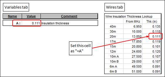 On the Wires tab, set the insulation thickness for the 20m band using the Excel formula "=A". Hence as the value for A is changed, either by you manually or by the optimizer automatically, the corresponding entry in the lookup table will change.