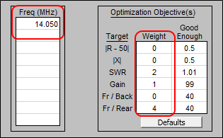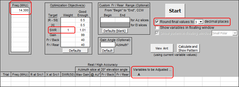 Back on the Variables tab, click the Optimizer Setup button. Select variable A and make sure no other variables names are selected, then click OK. The Optimize tab will appear. On that tab, set the frequency to the measured frequency of minimum SWR, 14.3 MHz in this example. Set the target weight for SWR as 1 and clear all the other target weights (or set them all to zero). Make sure that the final values will be rounded to at least 3 decimal places.