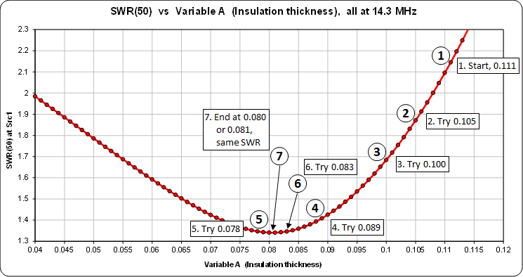 Be aware that the final value selected for A may vary in the last digit for different optimizer runs at the same frequency. That's because the optimizer rounds calculated SWR values to 3 decimal places. So if one value of insulation thickness produces a calculated SWR of 1.3408 and another thickness calculates out to SWR 1.3407, the optimizer will not waste time trying to distinguish between the two.