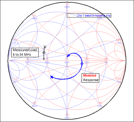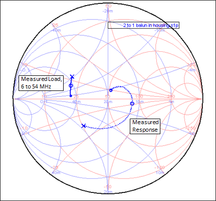 SO-239 is considered to be "transmission line to shack". Everything in between is called "balun" and that's what I wanted to simulate.The two measurement files were loaded into the SimSmith circuit simulator by AE6TY. Here is a Smith chart showing both measurements. The solid trace is the measured impedance of the load (the resistor). The dotted trace is the measured impedance at the SO-239, the input side of the balun. On both traces the small circle at one end is 6 MHz and the X at the other end is 54 MHz. The large circle on each trace is 30 MHz.