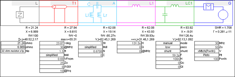 L-C-L "T" network which is used to simulate the various stray capacitance and inductance values in the real balun and associated wiring.So how close is the simulation circuit? This Smith chart shows the modeled (simulated) response as a blue solid trace. It overlays the blue dotted measured response almost perfectly. Both were with the same load, the 22 ohm resistor placed across the brushes.