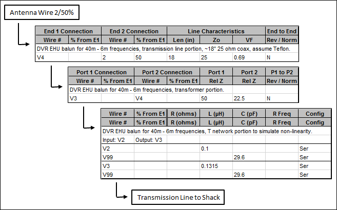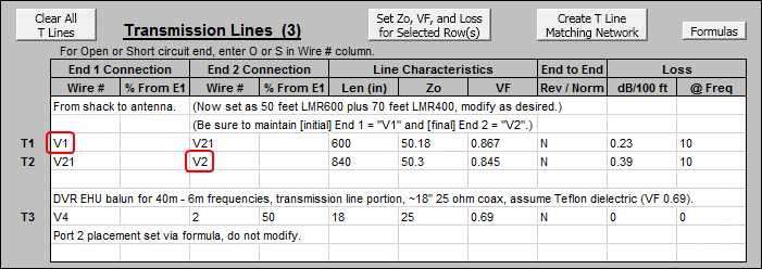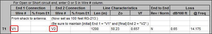 "=100 * 12". Do not modify the final entry shown in the table.If you do not want to include any shack-to-antenna transmission lines just delete both the first two entries and then change the source from V1 to V2. Or, if you only want to temporarily remove the transmission lines you can "mark them out" by placing an "x" or any other non-blank character in column A of the associated table row, along with changing the source position. To put the transmission lines back into the model just clear the marks and set the source position back to V1. (With Excel, a cell is cleared by first selecting it and then pressing the keyboard Delete key.) Again, do not modify the final entry shown in the table.