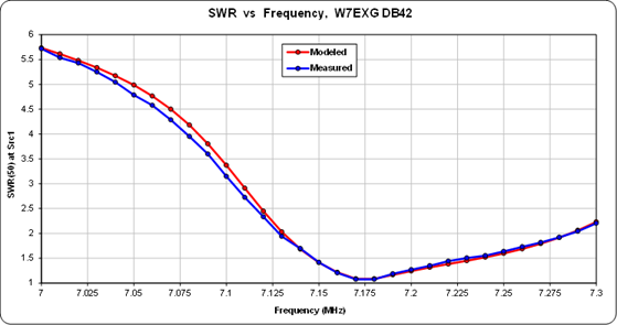 Having a frequency-agile "effective" insulation thickness as described in the previous section, along with a realistic balun model, means that it is possible to obtain very good correlation between measured and modeled SWR on multiple bands. For example, here is a comparison on 40m for a DB42 mounted at 58 feet above desert soil. Measurement data courtesy W7EXG, taken at the shack end of his transmission line using a RigExpert device.
