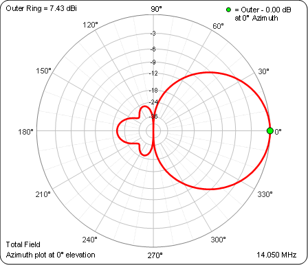 Using the AutoEZ optimizer to tweak the effective insulation thickness is a nice convenience but the real benefit of that tool lies in modifying the azimuth and/or elevation radiation patterns to suit your requirements on a given band.Still working with the DB18E as an example, suppose your interest is primarily CW on the low end of 20m. Here's the Free Space azimuth pattern (elevation 0°) at 14.050 MHz with the shack-to-antenna transmission lines temporarily removed.