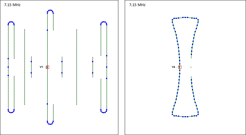 With any given Yagi the wires of the AutoEZ model are automatically reconfigured as the frequency is changed. In addition, the feedpoint is automatically changed if necessary for different bands and/or as the model is switched from Normal (Forward) to 180 (Reverse) to Bidirectional mode. Below left is an animation of how the wires of the DB42 model change from 40m to 6m. Notice the feedpoint switch at 14.175 MHz. Below right shows how the wires of the UrbanBeam change over the same frequency range.