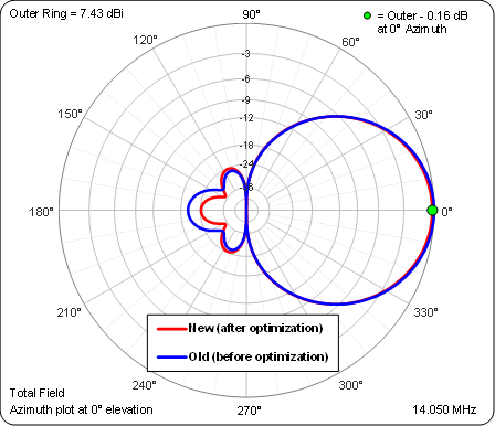 When the optimizer finishes you'll see that the F/R has been improved from 20 dB to 24 dB. (F/R is the range from 90° to 270° azimuth angle whereas F/B is exactly 180° only.) The SWR is also better (now 1.02) and to do both cost you less than 0.2 dBi in forward gain. Here's a comparison of the new and old patterns.
