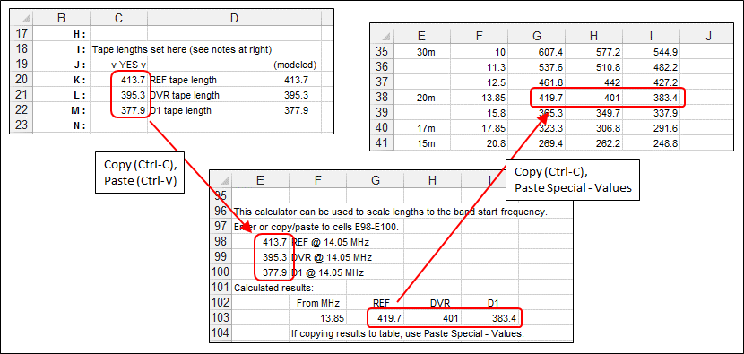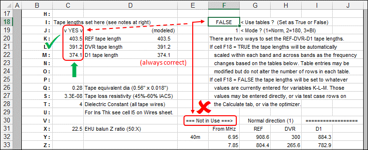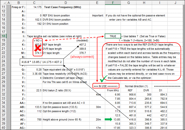 As you are working with a model make sure you keep track of the value in cell F18. If F18 is TRUE then the values shown for variables K, L, and M are ignored. The tape lengths used to construct the model will be as interpolated from the appropriate table entry. For example, in the screen grab above the current frequency (cell C11) is 14.175 MHz. So for the REF tape length, first the table entry for the 13.85 MHz band segment is found (416.8 inches) and then that value is scaled to the correct frequency