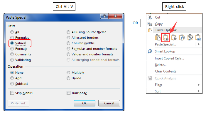 Ctrl-Alt-V , select "Values" in the dialog window, click OK; or b)Right-click on the target cell and click the Values icon from the context menu.