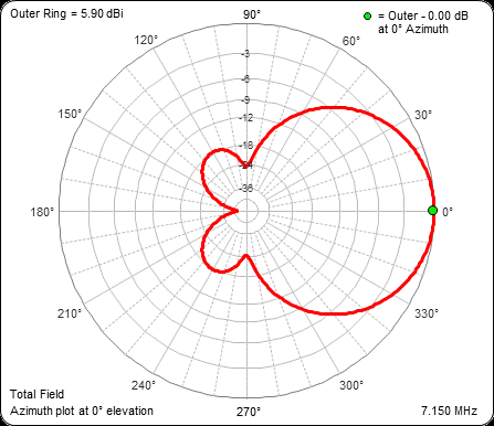 For example, the animation below shows the Free Space azimuth patterns (at 0° elevation) for the DB18E from 40m to 6m. The frequency for each frame is shown in the lower-right corner. The shack-to-antenna transmission line has been temporarily "marked out".
