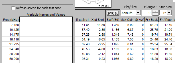 As before, start by verifying that the tape lengths as set by the controller are the same as those set by the model. Then pick an unused variable name on the Variables tab. Variable A is a good choice since A is not used by any of the AutoEZ models. Set the initial value for A as 0.111. Still on the Variables tab make sure F18=FALSE, tape lengths frozen at whatever they were when the SWR measurement was made.