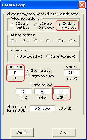Here is an example similar to the previous one but for a 160m loop. With AutoEZ, I first used this dialog to create a 4-sided horizontal loop having a perimeter of "P" ft at a height of "H" ft above ground.