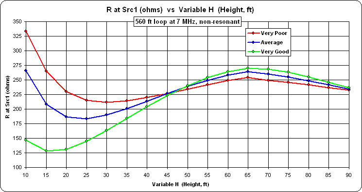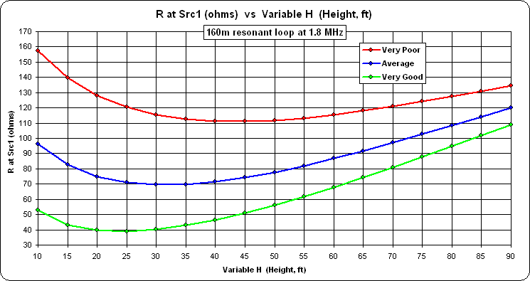 I then created a series of test cases with "H" ranging from 10 to 90 ft (~0.02 to 0.16 λ at 1.8 MHz) in 5 ft steps and with "P" having an initial value of 560 ft (~1005/Freq). Then the Resonate button was used to automatically adjust the loop perimeter "P" for resonance at each height.