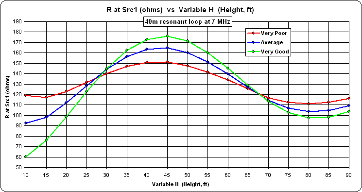 On the other hand, if you calculate the source resistance for a 40m resonant loop, where the loop perimeter is ~145 ft and where 90 ft above ground is ~0.65 λ instead of ~0.16 λ, you'll get this.