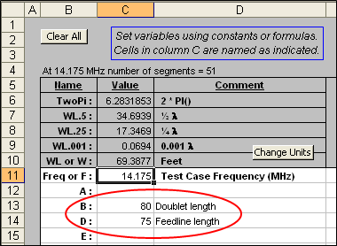 Starting with W5DXP's original specs of 80 ft for the antenna wire and 75 ft for the ladder line I defined two variables. Variable names "B" and "D" were used for this example but any names will do.