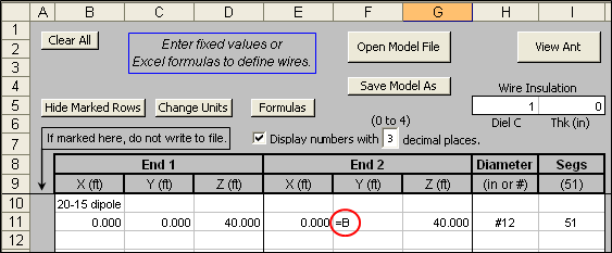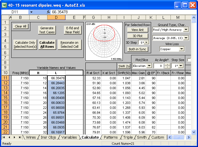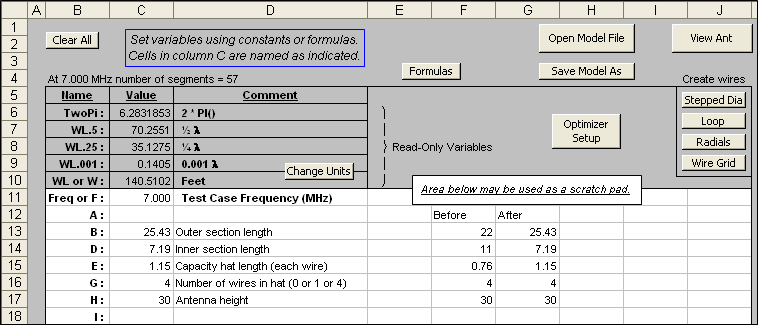 Here is a screen grab of the "Variables" sheet from AutoEZ. Although it would be possible to do all of the necessary adjustments manually with EZNEC, it's much easier to just change a few variable values (or let the optimizer change the values) to reconfigure the model geometry.