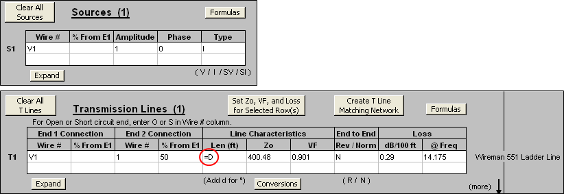 Next I created a transmission line of length "D" plus put the source on virtual wire "V1". So the connection sequence is V1 to transmission line to center of antenna wire (Wire 1 / 50%).