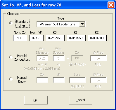 To set the Zo, VF, and loss characteristics of the transmission line I picked Wireman 551 from this dialog. You can choose from approximately 100 different standard line types or you can define you own wire diameter and spacing for parallel conductors.