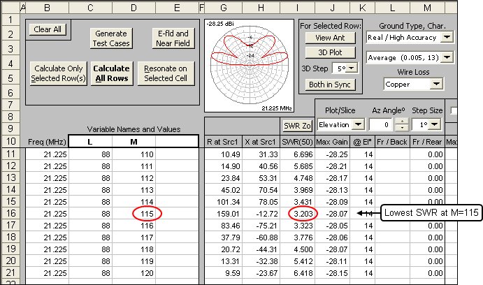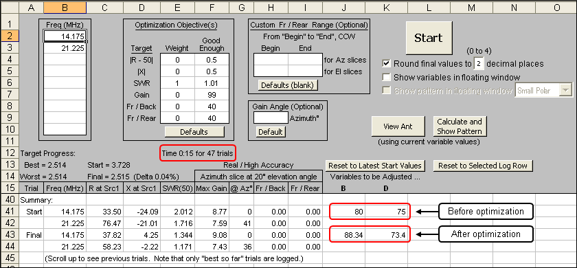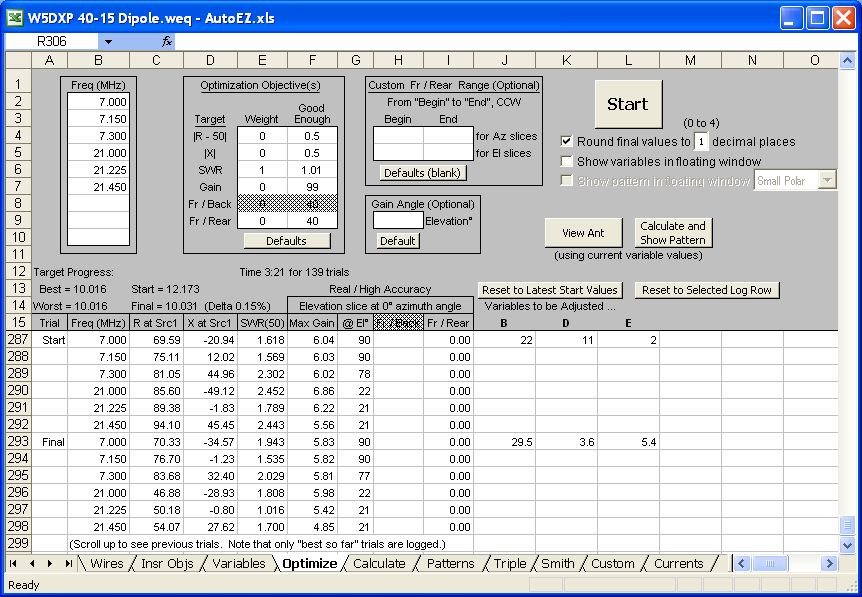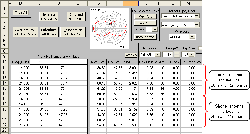 Rather than try to manually pick various combination of "B" and "D", the equivalent of "trim and test" for real antennas, I let the AutoEZ optimizer calculate the exact antenna length and the exact feedline length that gives a combined minimum SWR at 14.175 and 21.225 MHz. This screen grab show the Optimize sheet tab after the run completed, which took 15 seconds. Note that the only optimization target was SWR, no attention was paid to Gain.